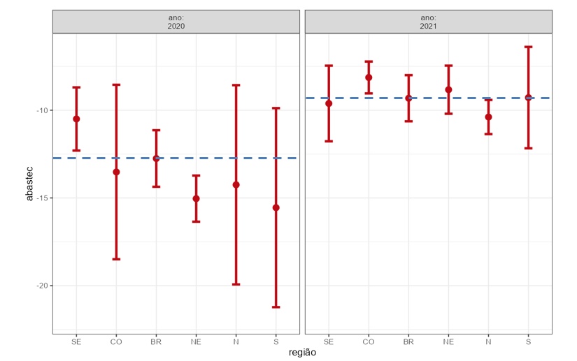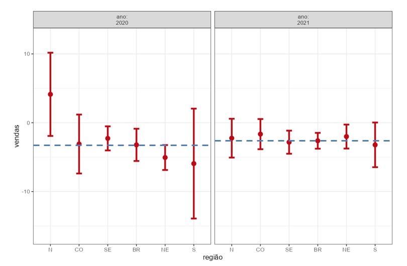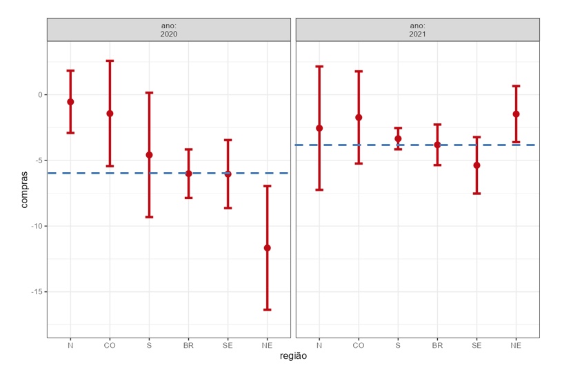 Do mesmo modo que o otimista enxerga o copo meio cheio e o pessimista enxerga o copo meio vazio, a análise deste gráfico permite um olhar ambíguo. Em linhas gerais podemos destacar que a média nacional passou de uma queda de -5% para -3%, o que é uma boa notícia. Entretanto esta diferença não é estatisticamente significativa, o que significa dizer em termos técnicos que não há diferenças reais entre os anos de 2020 e 2021. Como destaques podemos verificar a melhora substantiva da região Nordeste em 2021, com desempenho superior à média nacional e com uma redução importante na variabilidade, e a queda da região Sudeste para um patamar inferior à média nacional em 2021, apontando que nesta região a queda nas compras foi mais sentida.