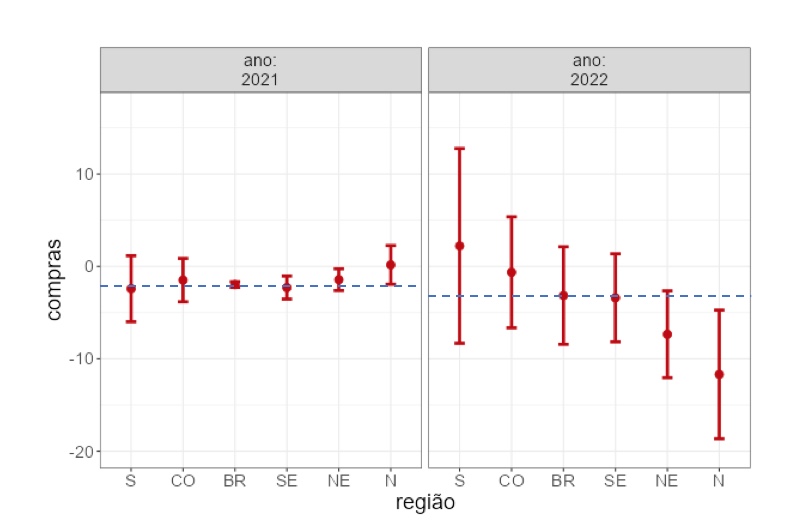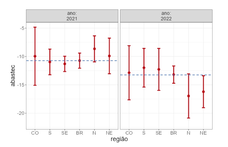 À primeira vista o que podemos verificar é que houve uma piora no abastecimento entre 2021 e 2022 no agregado Brasil, uma vez que os valores do eixo vertical são negativos. Se a média do Brasil em janeiro de 2021 era de -10,73%, em janeiro de 2022 passou para -13,19%, uma diferença 2,46 pontos percentuais. Outro ponto de destaque é que em 2021 apena as regiões Sul e Sudeste apresentavam desempenho pior que a média do Brasil, enquanto em 2022 esta posição foi ocupada pelas regiões Norte e Nordeste, com todas as regiões apresentando também uma grande variação durante o primeiro mês de 2022, como fica demonstrado no comprimento das linhas verticais vermelhas.