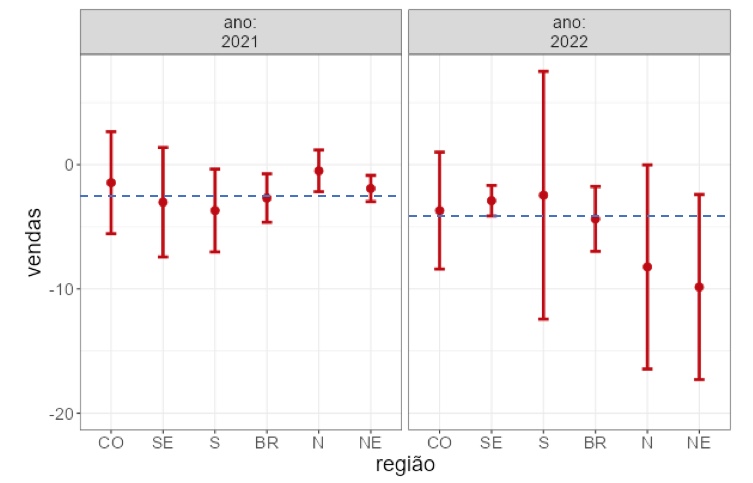 Um olhar rápido ao gráfico pode causar a impressão de que a variação nas vendas entre os meses de janeiro de 2021 e 2022 não foi tão grande, mas ao olhar atentamente notamos que a escala do eixo vertical está graduada em múltiplos de 10, e isso é importante pois se a queda média no Brasil em janeiro de 2021 foi de -2,68%, em janeiro de 2022 ela chegou a -4,36%, ou 1,68 pontos percentuais, uma ligeira queda que foi puxada pelas regiões Norte e Nordeste. Ao observarmos o ano de 2021 nota-se que, grosso modo, as variações médias foram em torno da média brasileira.