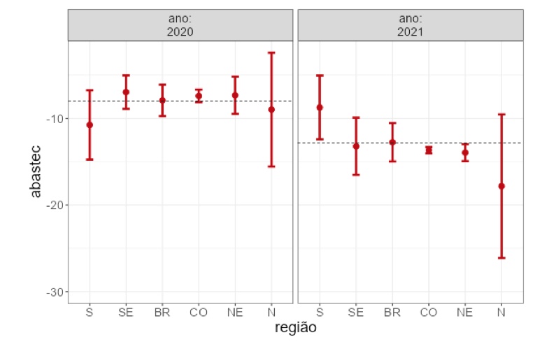 A linha horizontal preta tracejada representa a média nacional, que serve de baliza para comparação ao desempenho de cada região. Feitos os devidos comentários sobre a representação gráfica, passemos às análises começando pelo nível de abastecimento (ou ruptura no fornecimento).