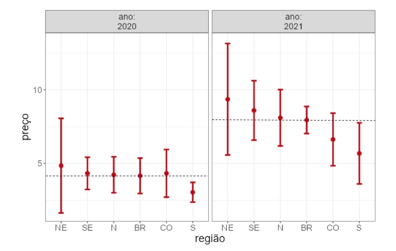 Na sequencia passamos a analisar os resultados relativos à variação nos preços. Se em 2020 as variações de preço foram quase que uniformes entre as regiões, com destaque para o Nordeste e para o Sul, o comportamento em 2021 mostra duas condições bastante importantes: (1) todas as regiões passaram a barreira dos 5% já que a média nacional em 2020 era de 4,15% e hoje está em 7,72%, e (2) as regiões Centro-Oeste e Sul com uma variação menor que a média nacional, mas ainda superior à média de 2020.