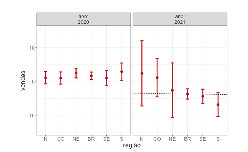 Finalmente, passamos a analisar o desempenho das compras. Se em 2020 a média das compras na região Sudeste se mantiveram praticamente no “zero a zero” e todas as demais regiões apresentaram crescimento, em 2021 a média nacional foi de -0,64%, um número negativo se comparado à média de 200 que foi de 1,10%, mas não estatisticamente significativo, ou seja, uma variação dentro do intervalo de confiança da medida. Não obstante, chama a atenção o desempenho positivo das regiões Norte e Centro-Oeste, bem como o desempenho negativo das regiões Nordeste e Sudeste, que apontam para quedas nas compras próximas a 5%.