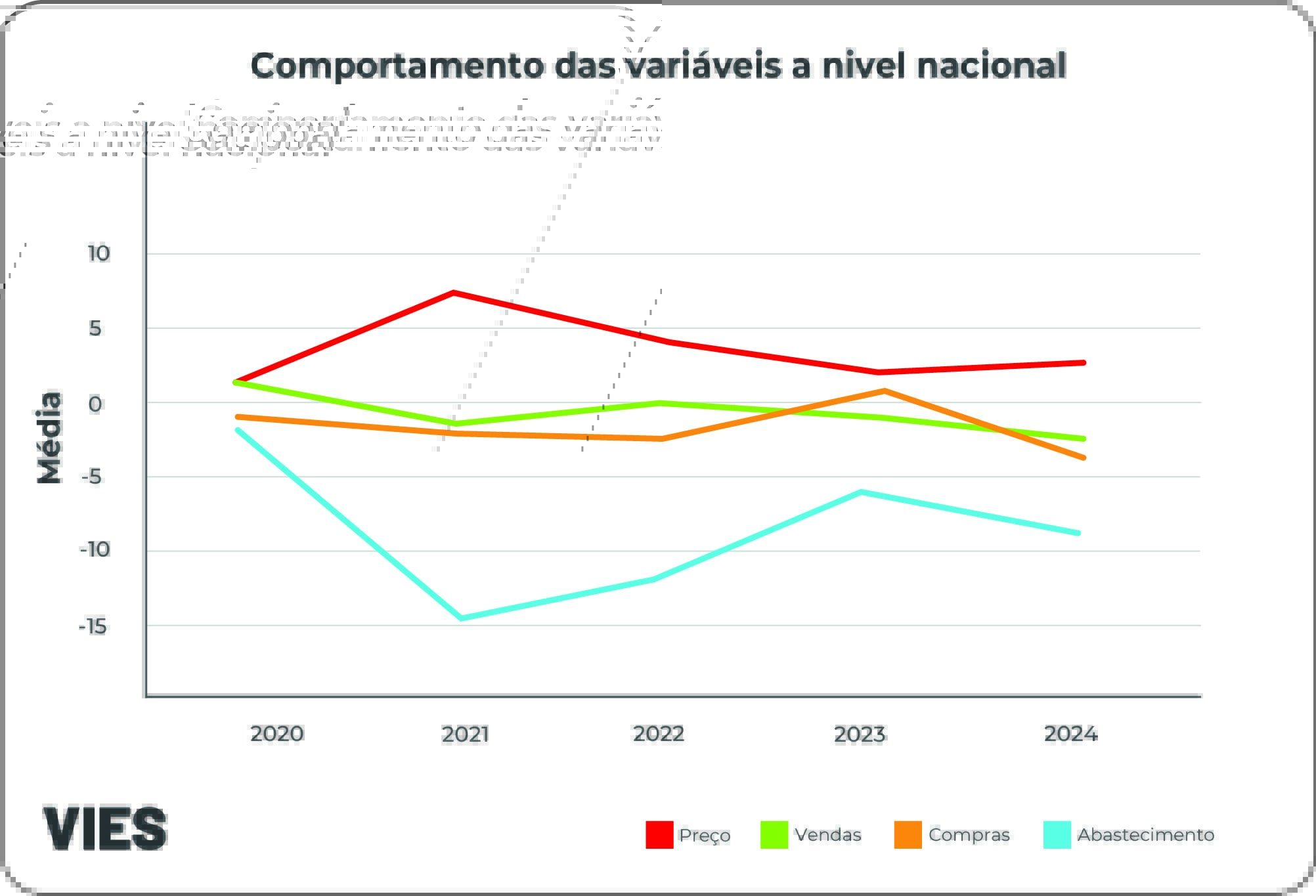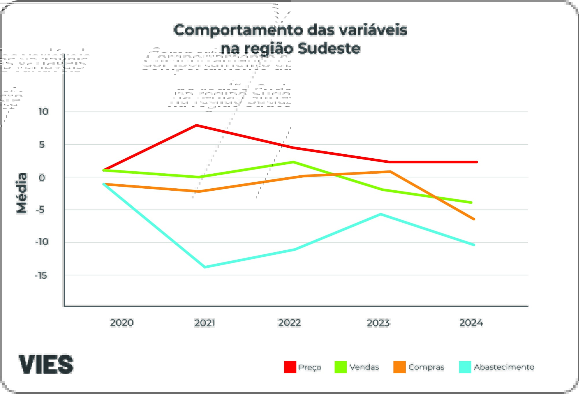 Por fim, analisamos o desempenho das variáveis na região Sudeste do país. Novamente é visto comportamento oposto nos níveis de abastecimento (-13,66%) e preço (7,43%) em 2021. Após pico positivo em 2021, os níveis de preço caíram constantemente nos anos seguintes, estacionando em 2,40% em 2024, enquanto os níveis de abastecimento sofreram recuperação nos dois anos seguintes a 2021 e voltaram a cair em 2024, estacionando em -10,11%.