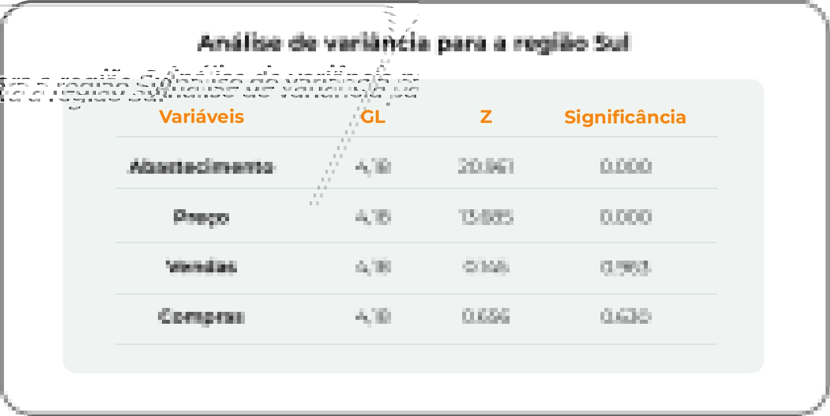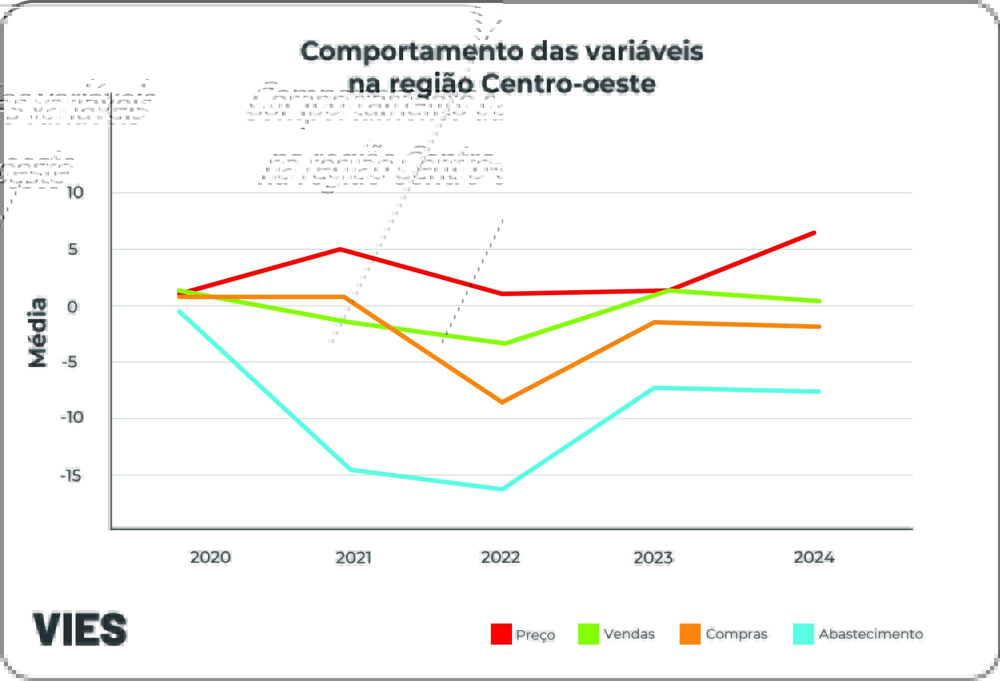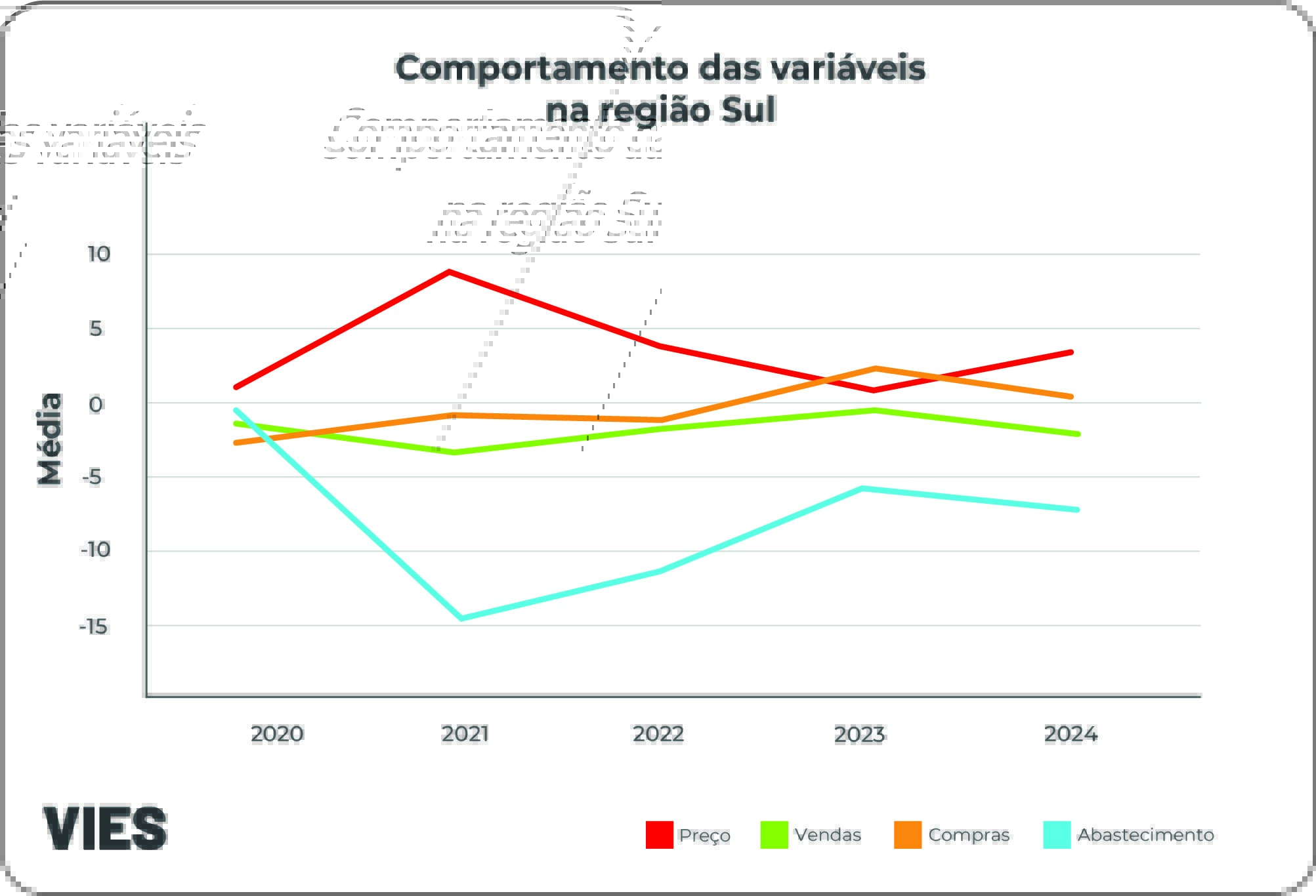 Na região Sul, os níveis de abastecimento e preço seguem o mesmo comportamento oposto observado nas outras regiões. Em 2021, quando o abastecimento atingiu seu ponto mais baixo (-13,38%), os preços alcançaram seu pico mais alto (8,29%). Isso acontece porque o preço funciona como um regulador que equilibra a oferta e a demanda. As vendas e as compras também seguiram padrões semelhantes. As vendas foram negativas no mês de julho de todos os anos. Os níveis de compras, que foram negativos nos três primeiros anos, melhoraram para 0,12% em 2024. Na análise ANOVA, apenas abastecimento e preço apresentaram variações significativas (p < 0,05).