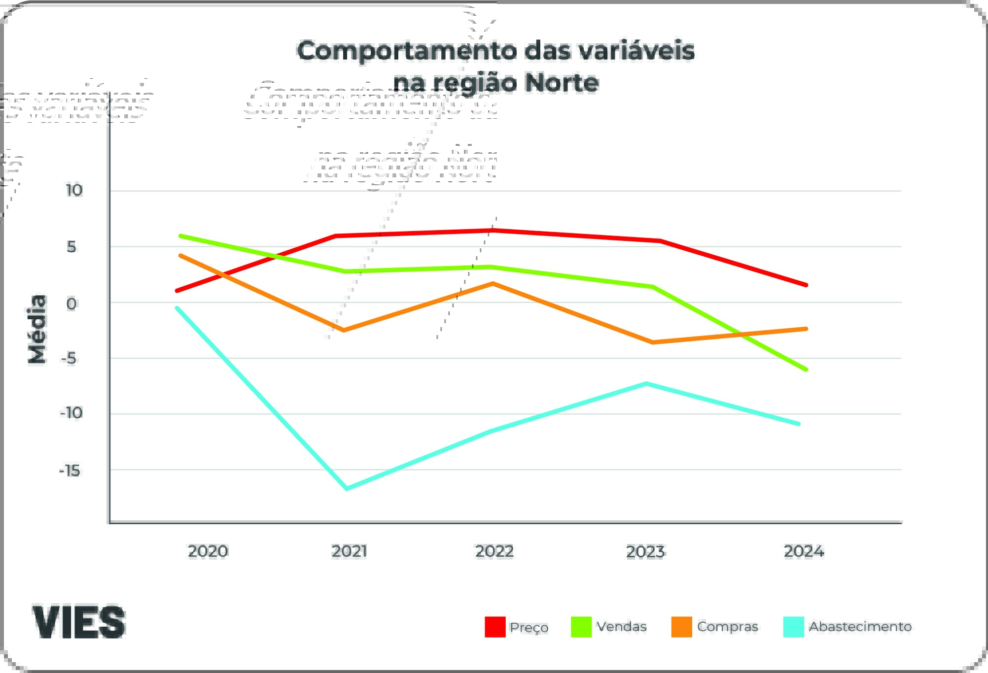 O Gráfico 3 mostra as informações da região Norte do país. Observamos uma queda acentuada nos níveis de abastecimento em 2021, com recuperações em 2022 e 2023, seguidas de outra queda em 2024. Em 2021, a média mensal de abastecimento chegou a -16,92%. Os níveis de preços aumentaram de 0,89% em 2020 para 5,65% em 2021, mantendo-se estáveis nos anos seguintes e caindo para 1,32% em 2024. As vendas tiveram uma queda constante e significativa desde 2020, passando de 5,48% para -6,13% em 2024. Os níveis de compras oscilaram constantemente no mês de julho de todos os anos, caindo para -2,42% em 2021, recuperando-se para 1,3% em 2022, e voltando a valores negativos em 2023 e 2024.