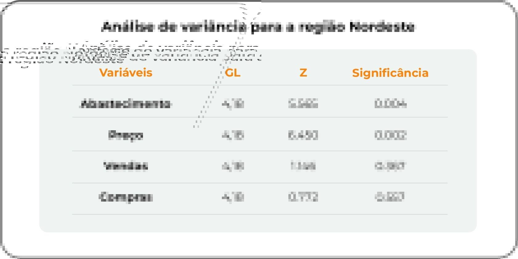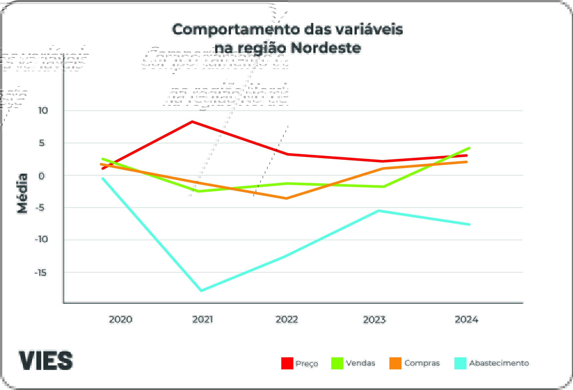 Na região Nordeste, o abastecimento teve comportamentos semelhantes aos da região Norte, chegando a -17,83% em 2021. Embora tenha havido recuperações nos anos seguintes, os níveis de abastecimento continuaram negativos. Os preços atingiram um pico de 7,86% em 2021 e se mantiveram estáveis nos anos seguintes, alcançando 2,82% em julho de 2024. As vendas foram negativas por três anos seguidos (2021 a 2023), mas se recuperaram e atingiram 3,85% em 2024. As compras também mostraram uma tendência de crescimento positivo, depois de dois anos de resultados negativos (-0,97% em 2021 e -3,12% em 2022), alcançando 2,11% em 2024. Na análise ANOVA, apenas o abastecimento e os preços apresentaram variações significativas (p < 0,05).