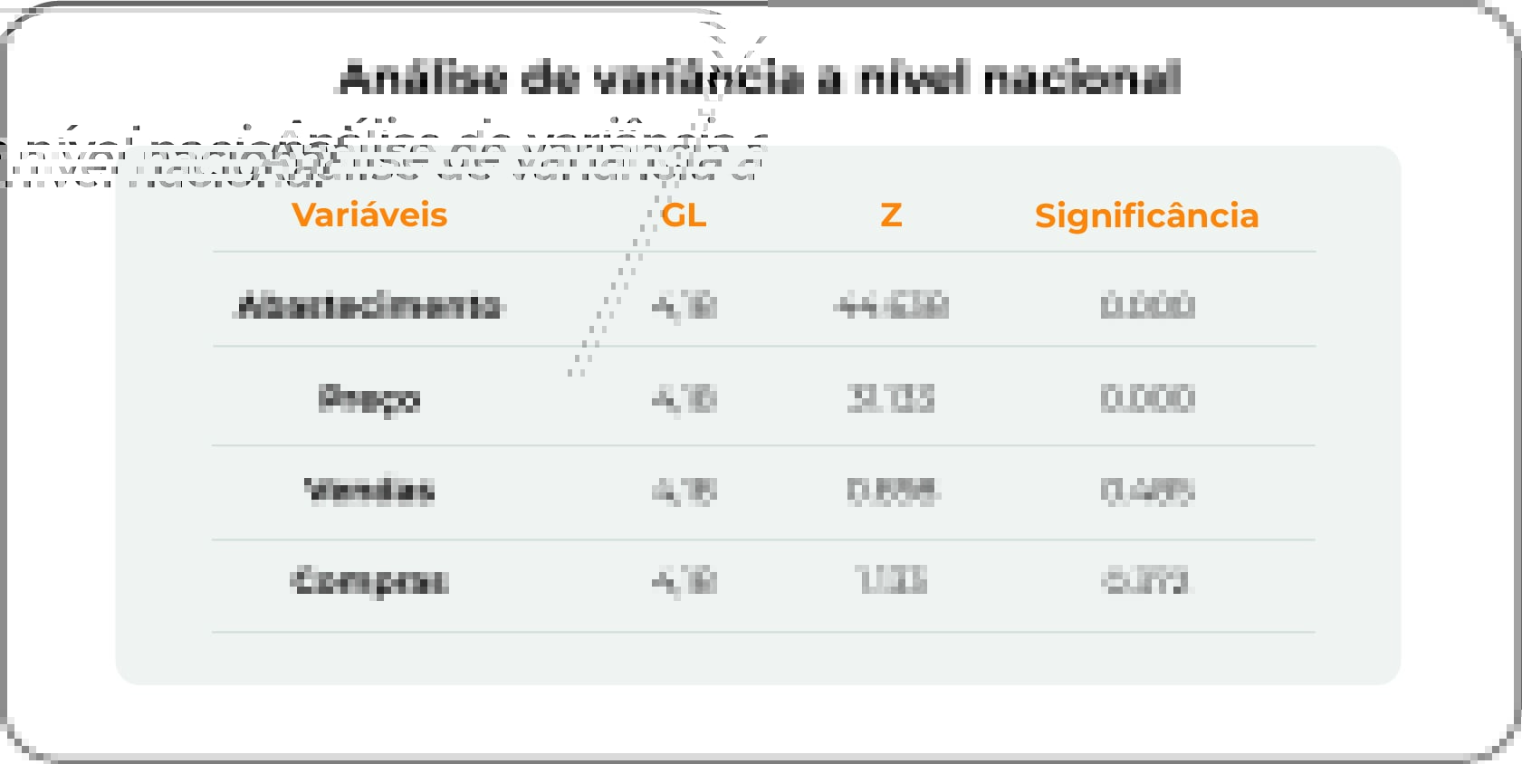Para os fãs de estatística, a interpretação da ANOVA mostra que abastecimento e preço apresentaram variações significativas ao longo dos anos (p < 0.05), ao passo que vendas e compras não apresentaram variações significativas ao longo dos anos (p > 0.05). O teste de Tuckey, realizado para corroborar os resultados da ANOVA, mostra que tanto para o abastecimento quanto para o preço, existem diferenças significativas observadas entre anos, particularmente entre 2021 e 2020.