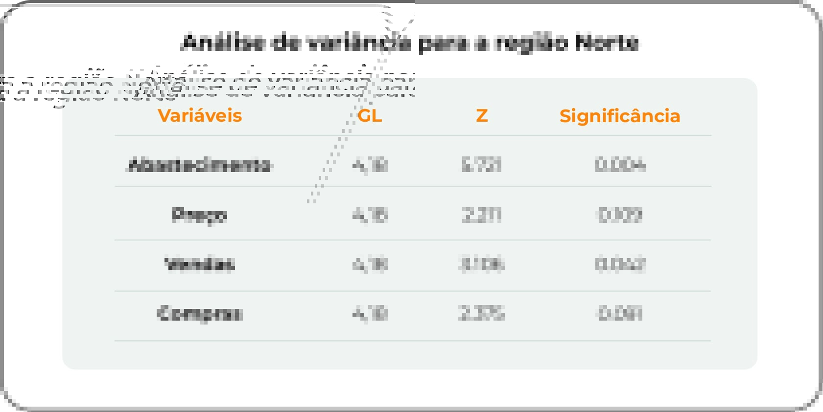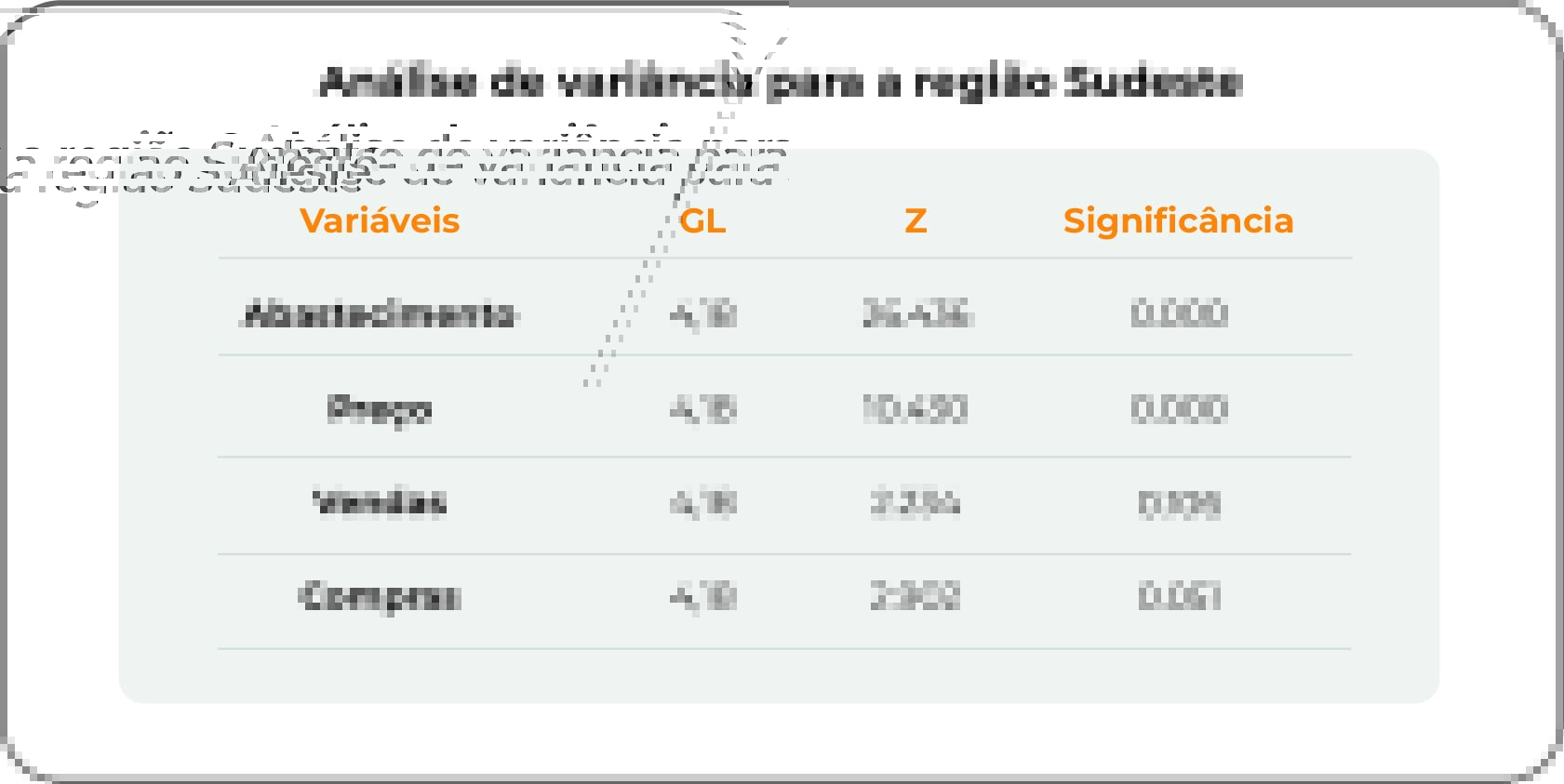 Agora vamos analisar as diferentes regiões, começando pela região Centro-Oeste do país. Nessa região, constatamos que, das quatro vertentes analisadas, o abastecimento foi a que apresentou maior variação. A análise de variância (ANOVA) mostrou que o abastecimento foi a única variável com variação significativa a 5% de significância (p < 0,05). Os níveis de abastecimento caíram de 0,84% em 2020 para -15,7% em 2022, estabilizando-se em valores próximos de -7% em 2023 e 2024. Os preços partiram de valores próximos a zero em 2020 e aumentaram para 5,93% em 2024, um crescimento considerável, apesar de não haver diferença estatística entre os anos. Os níveis de compra tiveram o menor valor em 2022, chegando a -5,25%, mas se recuperaram para -1,65% em 2024. As vendas apresentaram valores positivos em parte dos anos analisados, exceto em 2021 e 2022, com -0,97% e 5,20%, respectivamente.