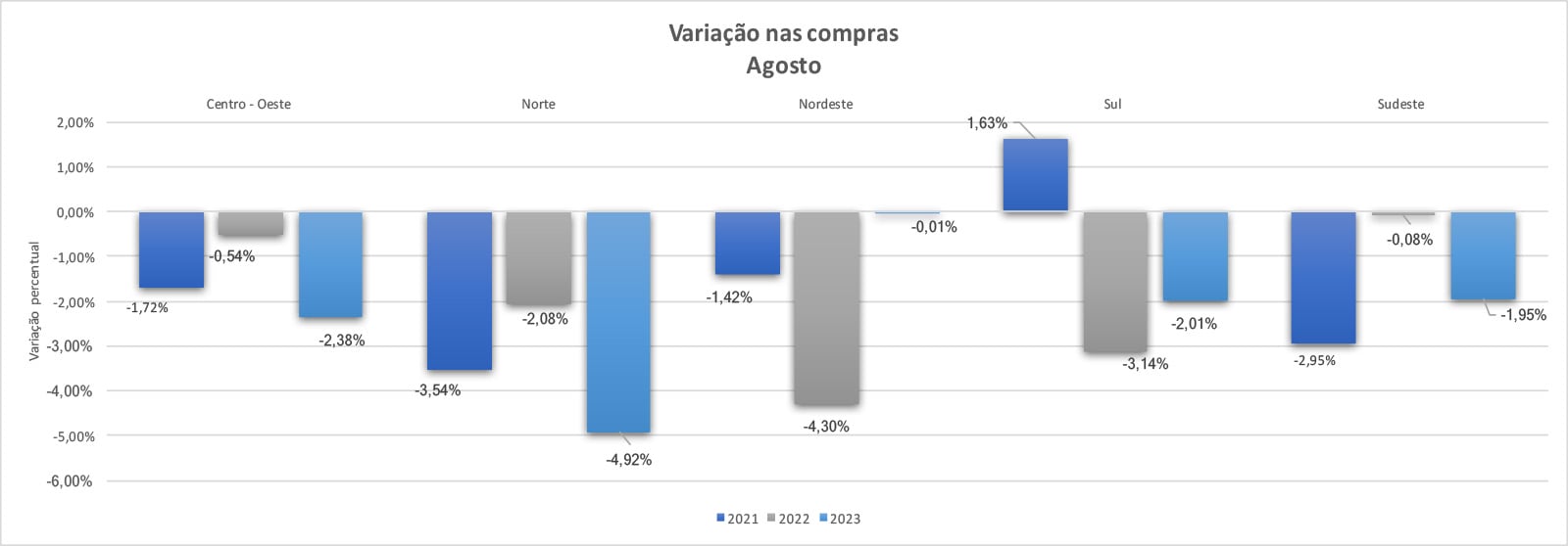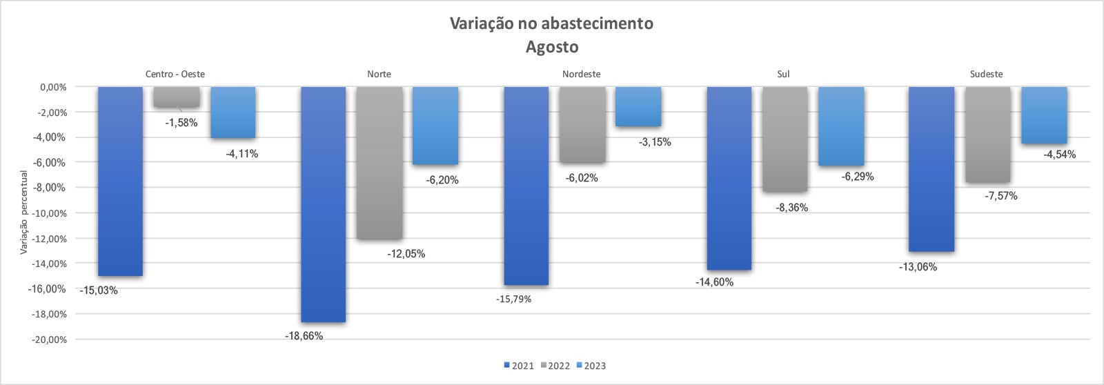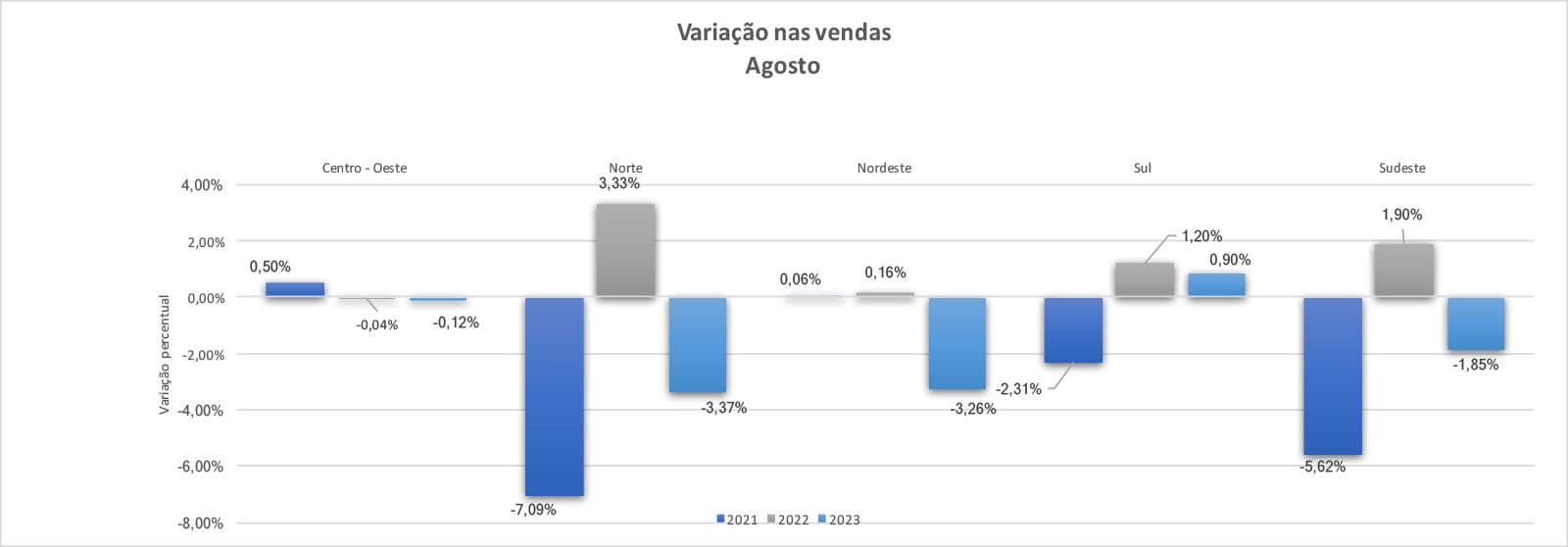 O índice configura piora na comparação com as compras registradas em 2022, também negativas, mas em -1,56%. No que se refere aos dados abrangidos pela pesquisa ONDA, o abastecimento do varejo continua sinalizado quebra: -4,69%. Apesar do resultado negativo, ainda houve ganho na comparação com a variação registrada ano passado, que ficou em -7,16%. Finalmente, o histórico de alta nos preços foi mantido, com expansão média de 2,83%, outro resultado melhor do que o registrado no ano anterior, que viu os preços avançarem 5,27%. A trajetória de preços a partir de 2021 vem registrando altas decrescentes. Acompanhe nos gráficos também os resultados regionais das vendas, compras, abastecimento e preços e compare o desempenho das lojas de autopeças em 2021, 2022 e 2023 nos meses de agosta. E, semanalmente nas plataformas digitais do NovoVarejo Automotivo, todos os resultados atualizados das pesquisas MAPA e ONDA.