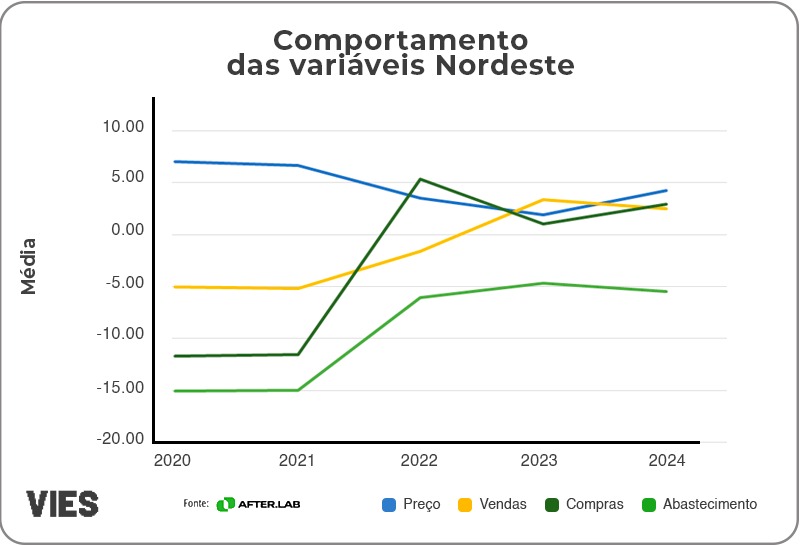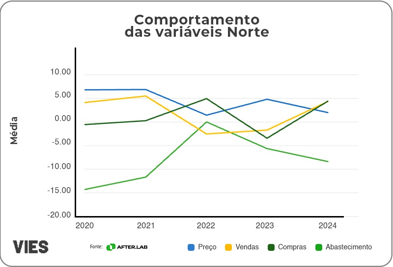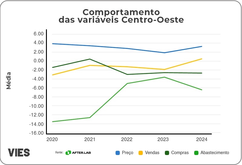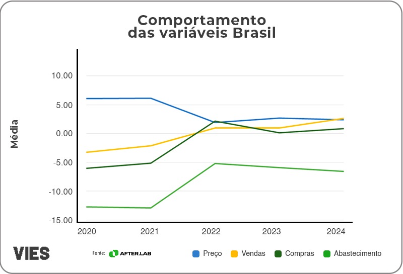 Na média nacional, no que diz respeito ao abastecimento, observou-se uma queda contínua ao longo dos anos. Em 2020, o abastecimento registrou uma retração de -12,75%, que se aprofundou em 2021 para -12,94%. A partir de 2022, essa queda começou a desacelerar, atingindo -5,19%, mas ainda apresentou redução em 2023 (-5,93%) e 2024 (-6,55%). Quanto aos preços, por outro lado, em 2020, estes subiram 6,09%, e em 2021 esse aumento foi ligeiramente maior, alcançando 6,16%. No entanto, entre 2022 e 2024, o ritmo de crescimento desacelerou significativamente, com elevações de 1,90% em 2022, 2,69% em 2023 e 2,40% em 2024.
