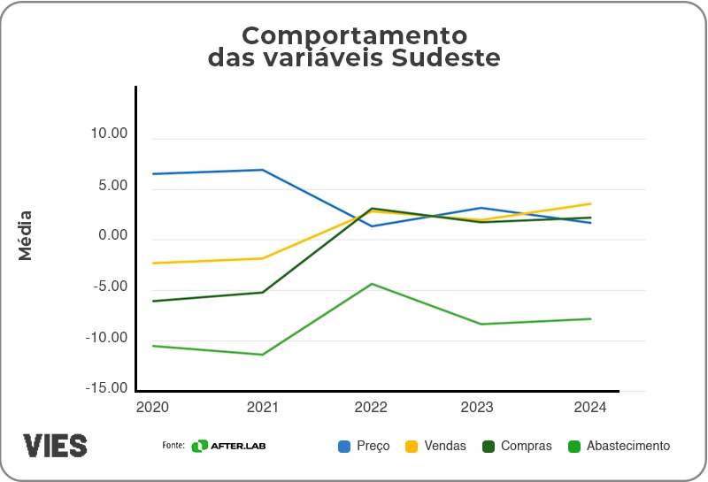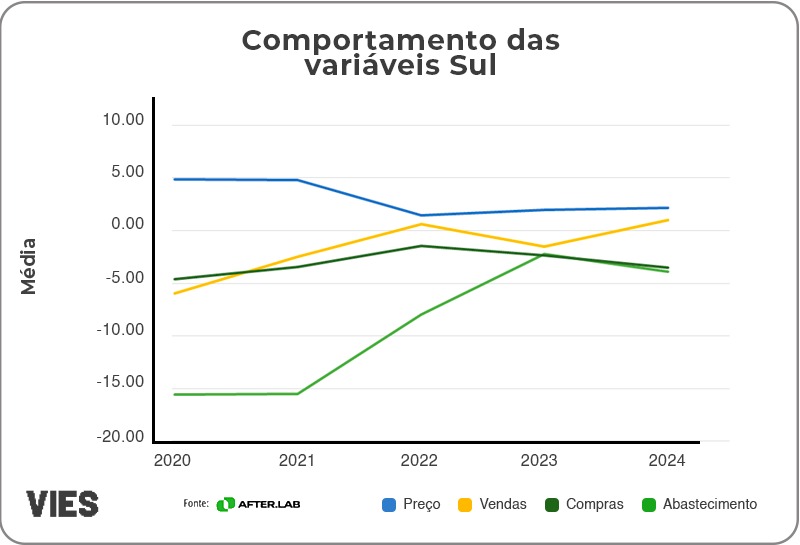 Na região Sul, o abastecimento registrou quedas acentuadas nos dois primeiros anos, com retrações de -15,55% em 2020 e -15,50% em 2021. Em 2022, a situação começou a melhorar, apesar de ainda existir uma retração de -7,94%. Nos anos seguintes, a queda foi ainda mais moderada, atingindo -2,24% em 2023 e -3,89% em 2024. Os preços tiveram aumentos constantes, mas em níveis moderados. Em 2020 e 2021, os preços subiram 4,89% e 4,82%, respectivamente. Nos anos seguintes, os aumentos foram mais suaves, com variações de 1,46% em 2022, 1,95% em 2023 e 2,15% em 2024.