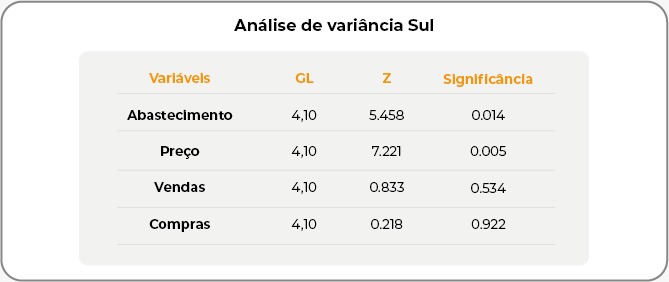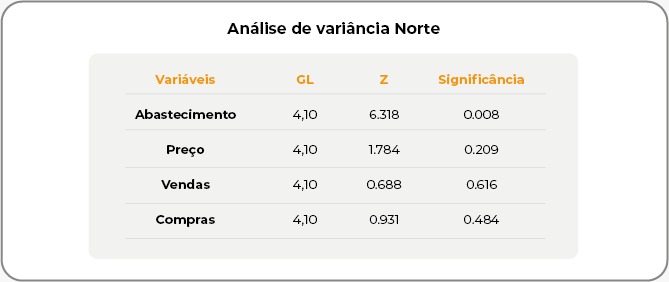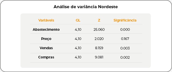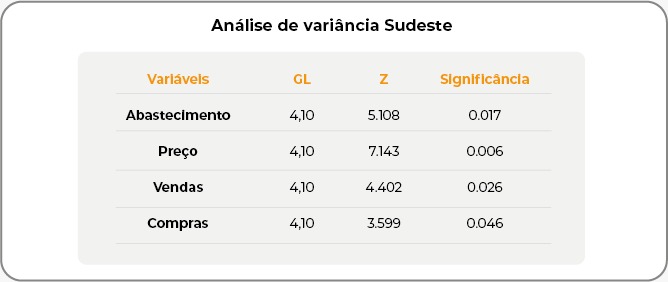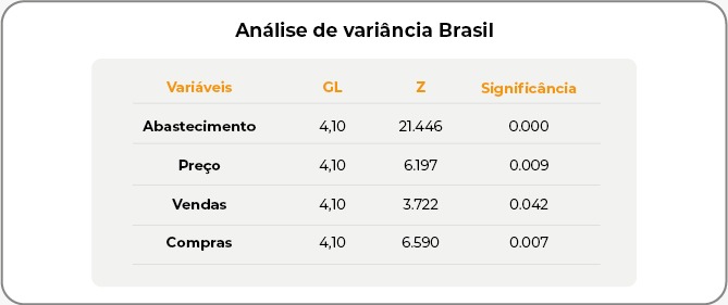 Quanto às compras, em 2020, houve retração de -1,43%, mas 2021 foi marcado por uma leve recuperação, com um aumento de 0,47%. No entanto, o cenário voltou a piorar em 2022 (-3,00%), 2023 (-2,55%) e 2024 (-2,65%). Na análise de variância, somente a variável abastecimento foi significativa a pelo menos 5% de significância.