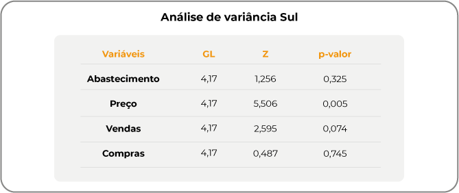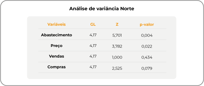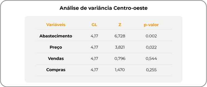 O abastecimento apresenta retração em todo o período analisado, com forte queda em 2021 (-13,66%) e sinais de melhora gradual até 2025 (-3,54%). Preços mantêm variação positiva, mas em desaceleração (de 6,62% em 2021 para 1,80% em 2025). Vendas e compras mostram comportamento instável. Após resultados positivos em 2021 e 2023, ambos os indicadores voltam a cair nos dois anos seguintes, encerrando 2025 com recuos expressivos (-3,81% nas vendas e -5,33% nas compras). Quanto a análise ANOVA, somente os indicadores de abastecimento e preço foram significativos a pelo menos 5% de significância (p-valor < 0,05).