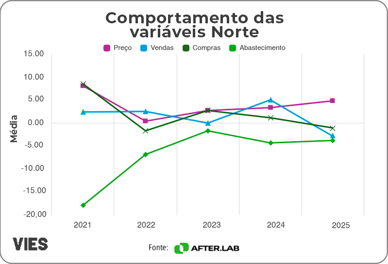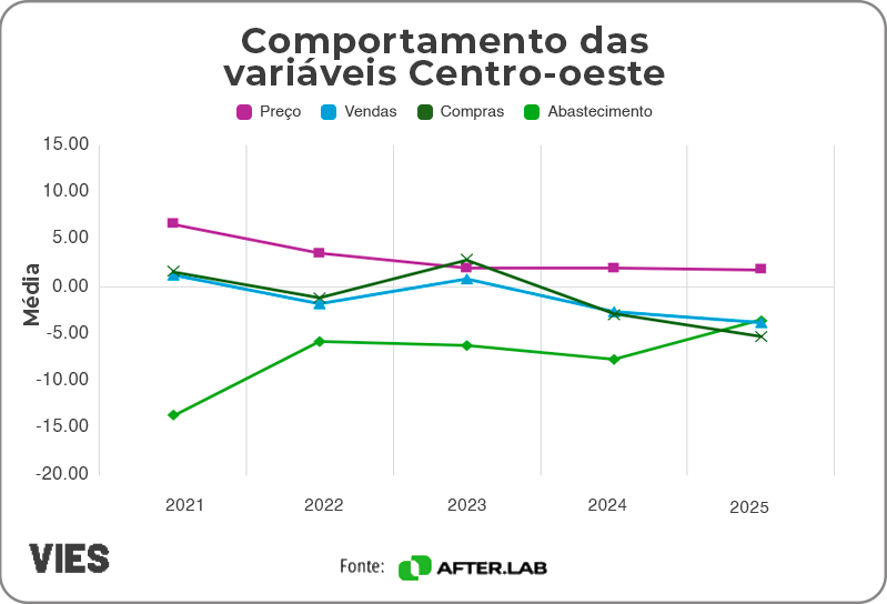 O abastecimento mostra melhora gradual, passando de queda de -8,73% em 2021 para -3,70% em 2025. Preços em tendência de alta, mas em ritmo cada vez menor de 5,68% em 2021 para 1,64% em 2025, refletindo cenário de estabilização após os aumentos mais fortes observados no início da série. Indicadores de vendas e compras permanecem negativos em praticamente todos os anos, com intensificação das quedas em 2025 (-2,95% e -4,26%, respectivamente). Na análise ANOVA, o indicador de preço foi significativo a pelo menos 5% de significância (p-valor < 0,05).
