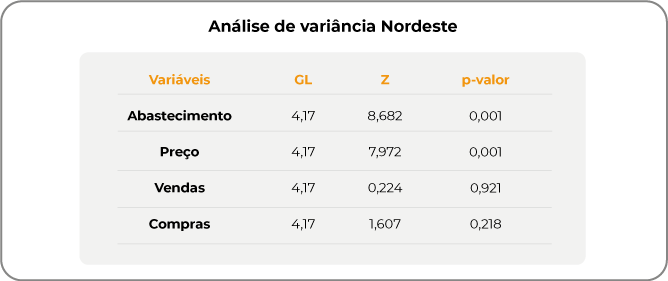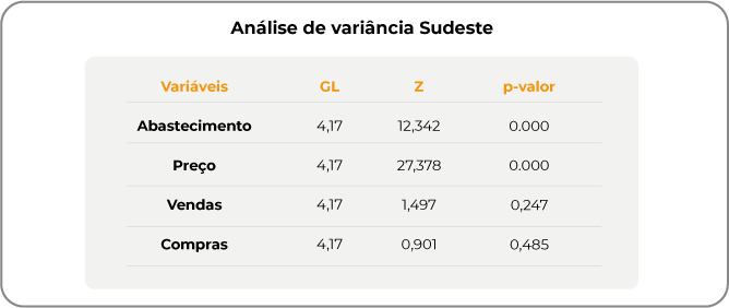 Abastecimento com quedas em todos os anos, com melhora moderada em 2025 (-4,78%) após início mais crítico em 2021 (-13,21%), indicando avanço gradual na normalização da oferta, ainda que com oscilações pontuais, como em 2024 (-7,72%). Preços mantêm trajetória de alta no período, mas em desaceleração (de 8,60% em 2021 para 1,38% em 2025). Vendas e compras com tendência de recuperação a partir de 2023, quando passam a registrar variações positivas, ainda que modestas. Em 2025, as vendas crescem 0,32%, enquanto as compras recuam levemente (-0,95%). Na análise ANOVA, os indicadores de abastecimento e preço foram significativos a pelo menos 5% de significância (p-valor < 0,05).