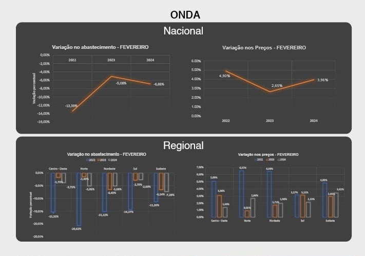 Os gráficos nacionais mostram que, em geral, o mercado varejista regrediu em relação aos indicadores de 2023. O desabastecimento que vem sendo sentido nas últimas semanas mais uma vez aparece na pesquisa, o que acaba resultando me alta nos preços e redução nas vendas e na reposição dos estoques. Na pesquisa MAPA, a média nacional das vendas mostrou queda de 1,47%, discreta piora em comparação a fevereiro do ano passado, que registrou -1,35%. Já nas compras o tombo foi bem maior: -1,33% ante alta de 1,19% em 2023. No que se refere aos dados abrangidos pela pesquisa ONDA, aí apenas se confirmam as megatendências que compõem longa trajetória iniciada na pandemia, mas com piora significativa neste ano em comparação a 2023. O abastecimento do varejo continua sinalizado queda: -6,88%, 1,8 ponto percentual acima do fechamento de fevereiro do ano passado na comparação com janeiro. Finalmente, o histórico de alta nos preços tem se mantido,agora agravado pela menor oferta de produtos, resultando num índice de 3,96%, tratado pela pesquisa como indicador de tendência. Acompanhe nos gráficos também os resultados regionais das vendas, compras, abastecimento e preços e compare o desempenho das lojas de autopeças em 2022, 2023 e 2024 nos meses de fevereiro. E, semanalmente, nas plataformas digitais do Novo Varejo Automotivo, todos os resultados atualizados das pesquisas MAPA e ONDA.