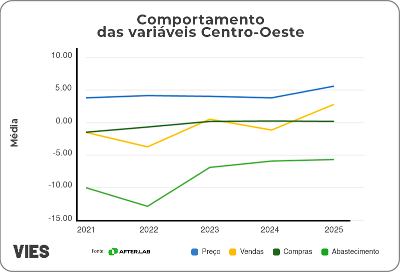 Na região Centro-Oeste, o abastecimento teve uma forte queda em 2022, seguida de recuperação gradual nos anos seguintes, mas ainda mantendo valores negativos. Observa-se que o preço manteve-se relativamente estável ao longo do período, com um leve crescimento em 2025 (5,59%).