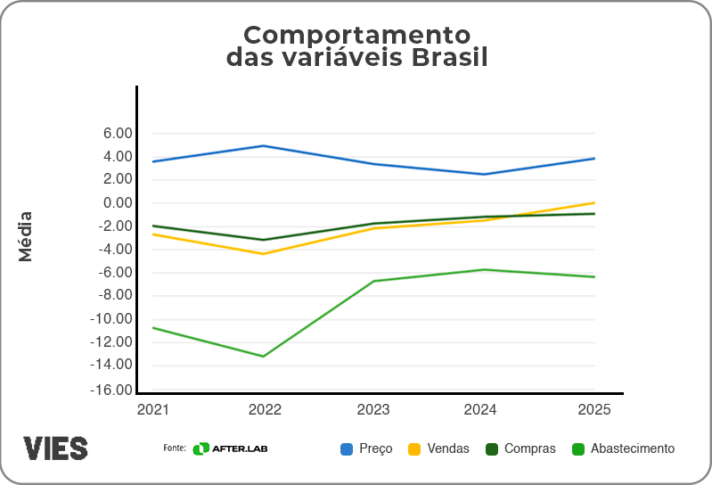 As vendas apresentaram grande variabilidade, começando com quedas em 2021 e 2022, uma leve recuperação em 2023 (0,32%) e pequenas retrações novamente nos anos seguintes, sugerindo um mercado instável. Já as compras apresentaram variações mais irregulares, com um leve crescimento em 2022 (2,22%), quedas em 2023 e 2024, e uma pequena recuperação em 2025 (0,59%). No geral, é detectado dificuldades no abastecimento e um mercado de demanda hesitante, enquanto os preços mantiveram um crescimento contínuo, porém moderado. Na análise ANOVA, somente o abastecimento apresentou variação significativa (p < 0,05).