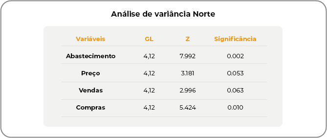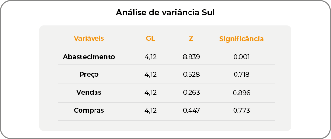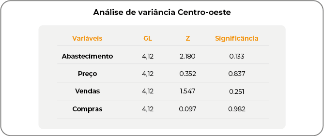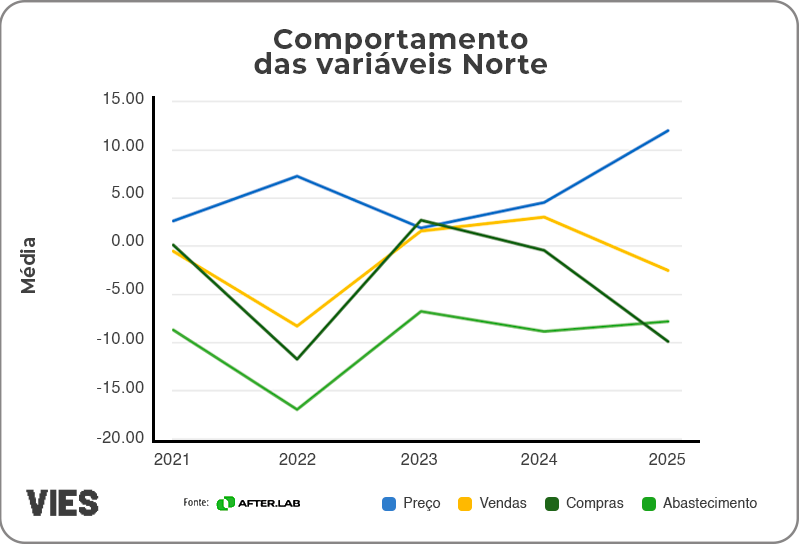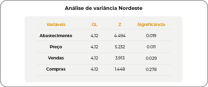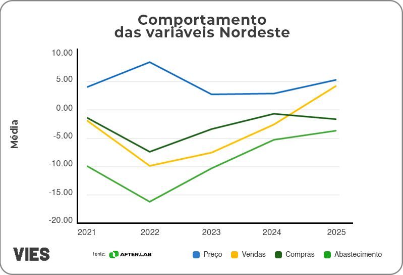 Na região Nordeste, houve uma queda contínua no abastecimento, que atingiu sua pior marca em 2022 (-16,21%) e apresentou recuperação gradual nos anos seguintes, mas sem alcançar valores positivos. O preço, por sua vez, registrou crescimento em todos os anos, com destaque para 2022 (8,41%) e 2025 (5,27%). As vendas e compras também apresentaram oscilações negativas na maior parte do período. As vendas caíram significativamente em 2022 (-9,85%) e 2023 (-7,56%), mas mostraram recuperação em 2024 e atingiram crescimento positivo em 2025 (4,25%). Já as compras mantiveram um desempenho negativo ao longo de todos os anos, com a maior queda em 2022 (-7,34%) e pequenas variações nos anos seguintes. Na análise ANOVA, exceto as compras não apresentaram variações significativas (p<0,05).