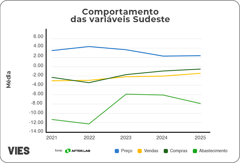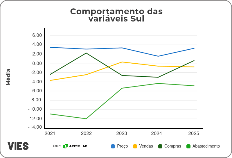 Já na região Sudeste, o abastecimento se mostrou em queda contínua, com a maior retração em 2022 (-12,28%) e uma recuperação parcial nos anos seguintes, embora ainda mantendo valores negativos. O preço apresentou crescimento moderado ao longo do período, com o maior aumento em 2022 (4,35%) e uma desaceleração gradual nos anos seguintes, chegando a 2,41% em 2025.