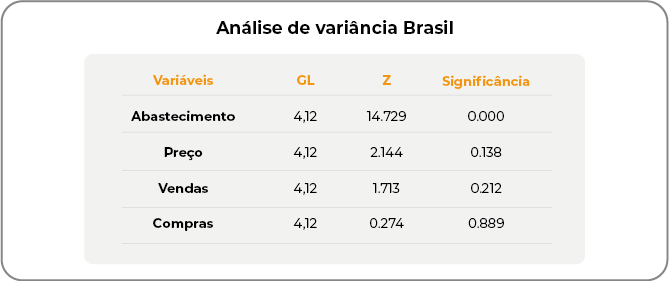 As vendas registraram quedas sucessivas em todos os anos, embora em tendência de melhora, passando de -3,02% em 2021 para -1,41% em 2025, indicando uma redução no ritmo de queda. As compras também apresentaram desempenho negativo ao longo do período, mas com quedas menos evidentes a cada ano, passando de -2,29% em 2021 para -0,51% em 2025. Na análise de variância, somente o abastecimento apresentou variação significativa, com um nível de confiança de pelo menos 5%.