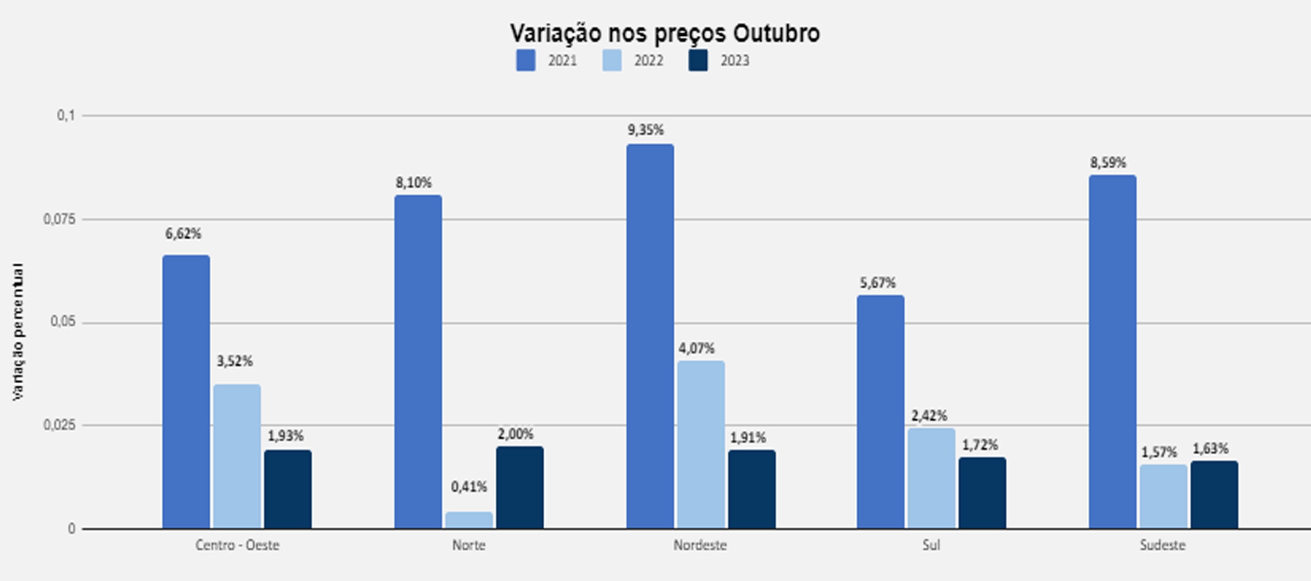 No que se refere aos dados abrangidos pela pesquisa ONDA, o abastecimento do varejo continua sinalizado quebra: -4,98%. Apesar do resultado negativo, ainda houve ganho na comparação com a variação registrada nos dois anos anteriores, como mostra o gráfico a seguir: -5,92% em 2022 e -12,74% em 2021. Finalmente, o histórico de alta nos preços foi mantido, porém também com curva favorável em relação aos dois anos anteriores. Agora, a expansão média ficou em 1,79% em outubro de 2023, contra 2,29% em 2022 e 7,94% em 2021. Em geral, a trajetória de preços a partir de 2021 vem registrando inflação decrescente. Acompanhe nos gráficos também os resultados regionais das vendas, compras, abastecimento e preços e compare o desempenho das lojas de autopeças em 2021, 2022 e 2023 nos meses de outubro. E, semanalmente nas plataformas digitais do NovoVarejo Automotivo, todos os resultados atualizados das pesquisas MAPA e ONDA.