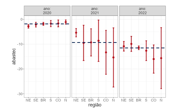 Ao analisar o gráfico fica evidente que a quebra/ruptura do abastecimento foi se deteriorando ao longo dos anos. Se em junho de 2020 a média percebida no agregado país no abastecimento era de -1,83%, esta quebra passou para -9,28% em junho de 2021 e alcançou -11,47% em junho de 2022. Para aqueles que se interessam pela estatística, neste caso utilizamos uma ANOVA, com F(2, 9) = 9,875, p = 0,005.