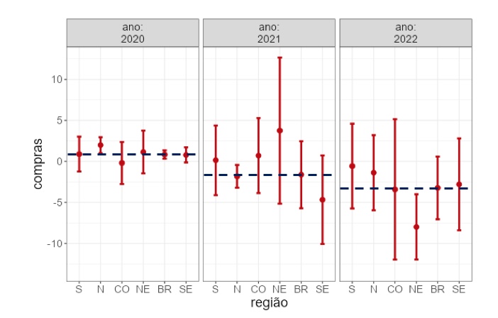 Mas foi na região Nordeste em que as variações na Compras mostrou-se de forma estatisticamente significativa [F(2, 9) = 4,460, p = 0,045], com as oscilações se comportando conforme apresentado no gráfico a seguir.