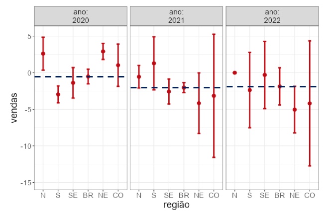 Mas foi na região Nordeste que os efeitos da variação nas Vendas foi estatisticamente significativa, passando de 2,91% em junho de 2020, para -4,16% em junho de 2021, e para -5,04% em junho de 2022 [F(2, 9) = 8,018, p = 0,010].