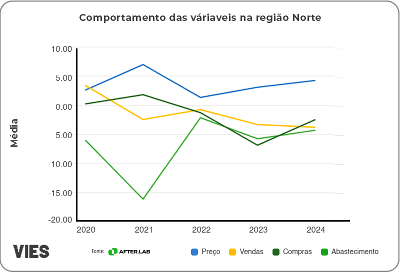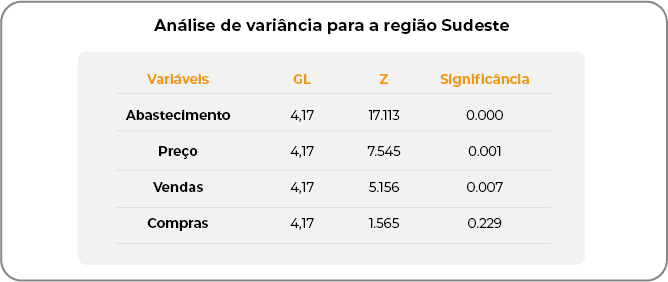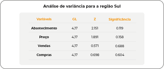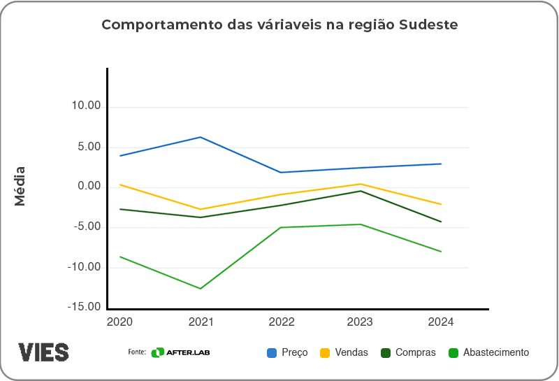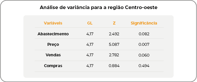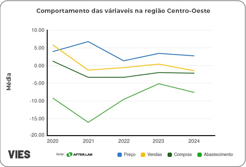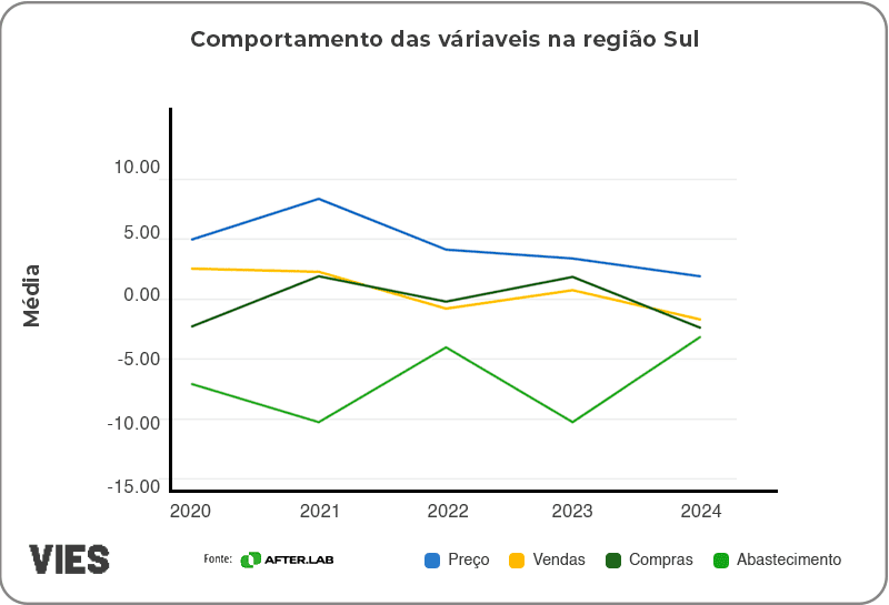 Os níveis de abastecimento e preço seguem o mesmo comportamento oposto observado nas outras regiões. Os preços alcançaram o pico mais elevado (8,37%) no mesmo período em que o nível de abastecimento atingiu seu patamar mais baixo (-10,23%). Isso acontece porque o preço funciona como um regulador que equilibra a oferta e a demanda. As vendas foram positivas em 2020 e 2021, decaíram para valores negativos em 2022 (-0,78%), recuperando-se em 2023 e fechando 2024 com desempenho negativo de -1,66%. Os níveis de compras que exibiram resultados negativos em 2020, foram recuperados para níveis positivos nos três anos seguintes, mas fecharam setembro de 2024 com desempenho negativo de -2,37%. Na análise ANOVA, todas as variáveis não apresentaram variações significativas (p < 0,05).