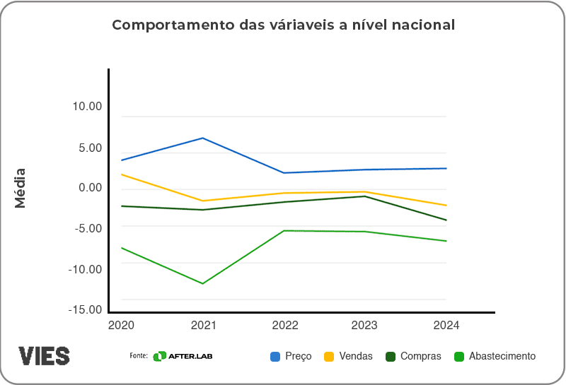 Houve queda acentuada nos níveis de abastecimento em 2021, com recuperações em 2022 e nova queda em 2023, seguidos de outra recuperação em 2024. Em 2021, a média mensal de abastecimento chegou a -16,1%. Os níveis de preços aumentaram de 2,66% em 2020 para 7% em 2021, caindo para 1,33% em 2022 e se recuperando nos anos seguintes. As compras tiveram uma queda constante e significativa entre 2021 e 2023, passando de 1,86% em 2021 para -6.83% em 2023 recuperando-se em 2024. Os níveis de vendas saíram de valores positivos em 2020 para resultados negativos nos anos seguintes, chegando a -3,75% em 2024. Na análise ANOVA, verificamos que somente as vendas foram constantes (sem diferença estatisticamente significativa ao longo dos anos).