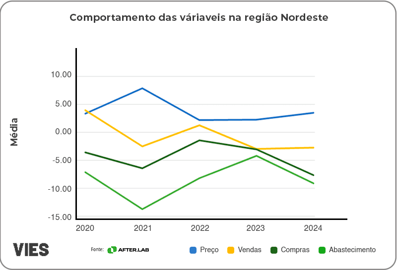 O abastecimento exibiu comportamentos similares aos da região Norte, chegando a -13,77% em 2021. Apesar das seguidas recuperações nos anos seguintes, os níveis de abastecimento continuaram negativos, fechando 2024 em -9,14%. Os preços atingiram um pico positivo de 7,94% em 2021 e caíram nos anos seguintes, com leve recuperação em 2024, quando atingiu 3,55%. As vendas passaram por oscilações positivas e negativas entre 2020 a 2023, quando engatou uma sequência negativa no ano seguinte, desempenhando -2,7% em 2024. As compras mostraram percentual de desempenho negativo em todos os anos aqui analisados, fechando 2024 com mais uma queda e atingindo -7,63%. Na análise ANOVA, exceto as compras não apresentaram variações significativas (p<0,05).