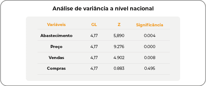 Os níveis de abastecimento desempenharam grande variação ao longo dos anos, sempre exibindo valores negativos. Destaque para o pico negativo em 2021: -16%, ao passo que o melhor desempenho ocorreu em 2023: -5,1%. Os níveis de vendas e compras desenharam comportamentos parecidos: positivos em 2020 com queda para valores negativos e constância nos anos seguintes. Já o preços exibiram pico positivo em 2021 (6,8%) e menor pico em 2022 (1,3%). Em 2024, observamos quedas no desempenho do abastecimento, preço e vendas e compras. Na análise da anova, apenas o preço mostrou diferenças estatisticamente significantes.